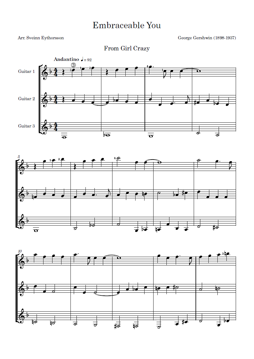 A graceful and enduring classic, Embraceable You is a wonderful addition to any guitar trio repertoire—perfect for performances that call for warmth, elegance, and timeless style.